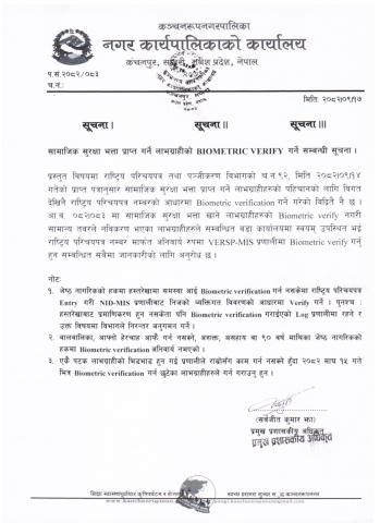सामाजिक सुरक्षा भत्ता प्राप्त गर्ने लाभग्राहीको Biometric Verify गर्ने सम्बन्धि सूचना ।